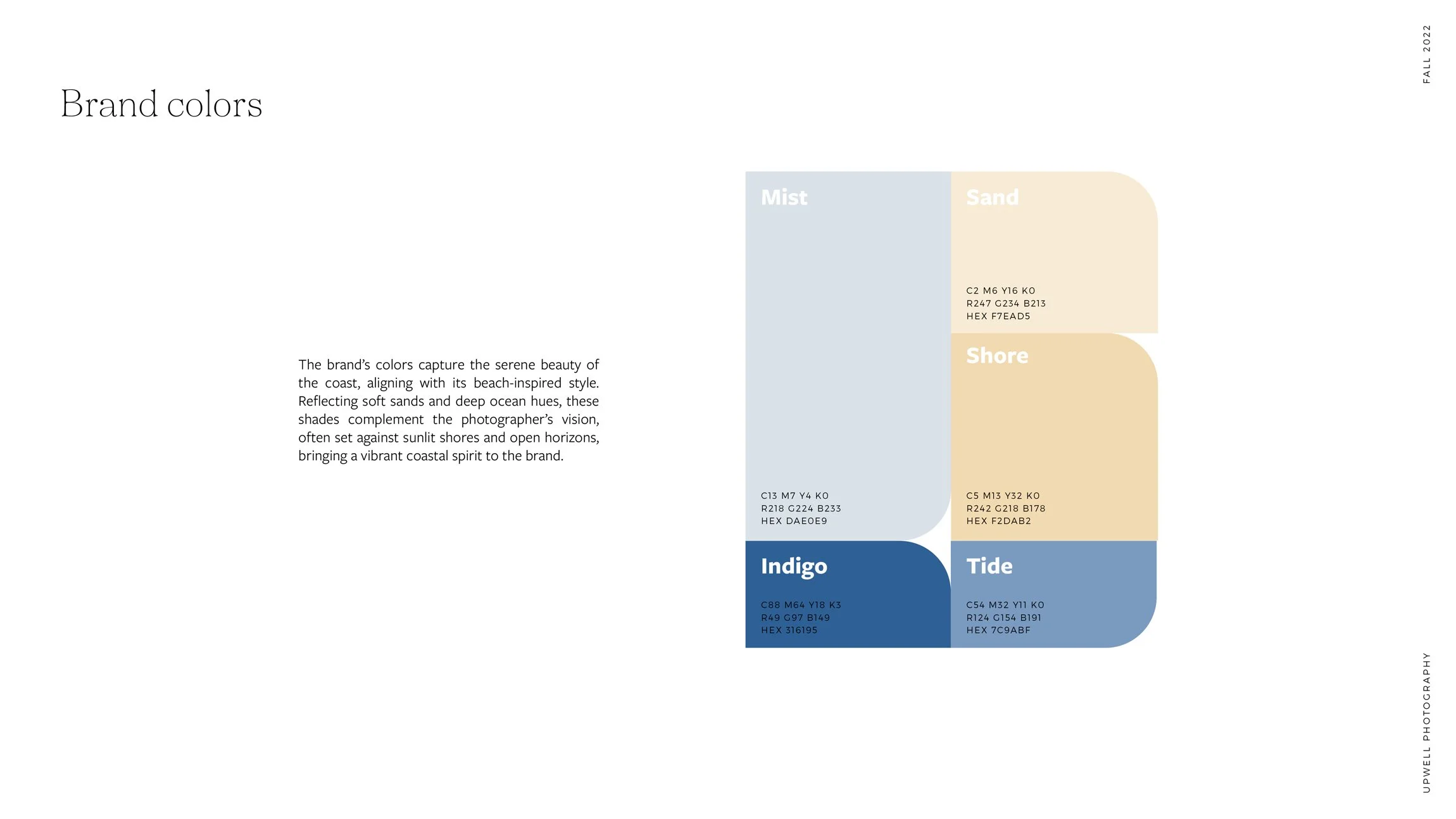 A color palette with five beach-inspired shades: Mist, Sand, Shore, Indigo, and Tide, each with their color codes and descriptions, demonstrating a coastal brand aesthetic.