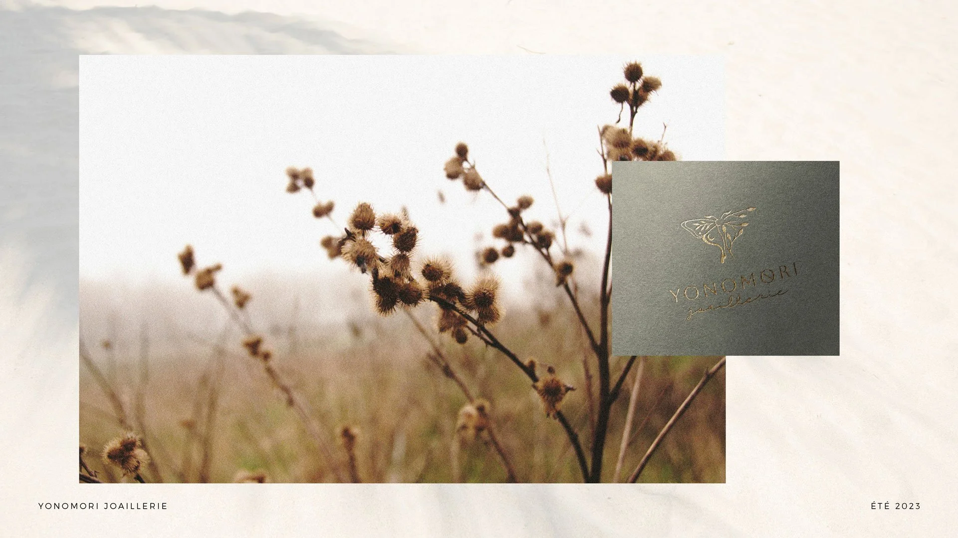 A photograph of dried wildflowers in a field with a beige overlay and a small square with a butterfly logo and the text "YONOMORI Joaillerie". The bottom left has "YONOMORI Joaillerie" and the bottom right has "ÉTÉ 2023."