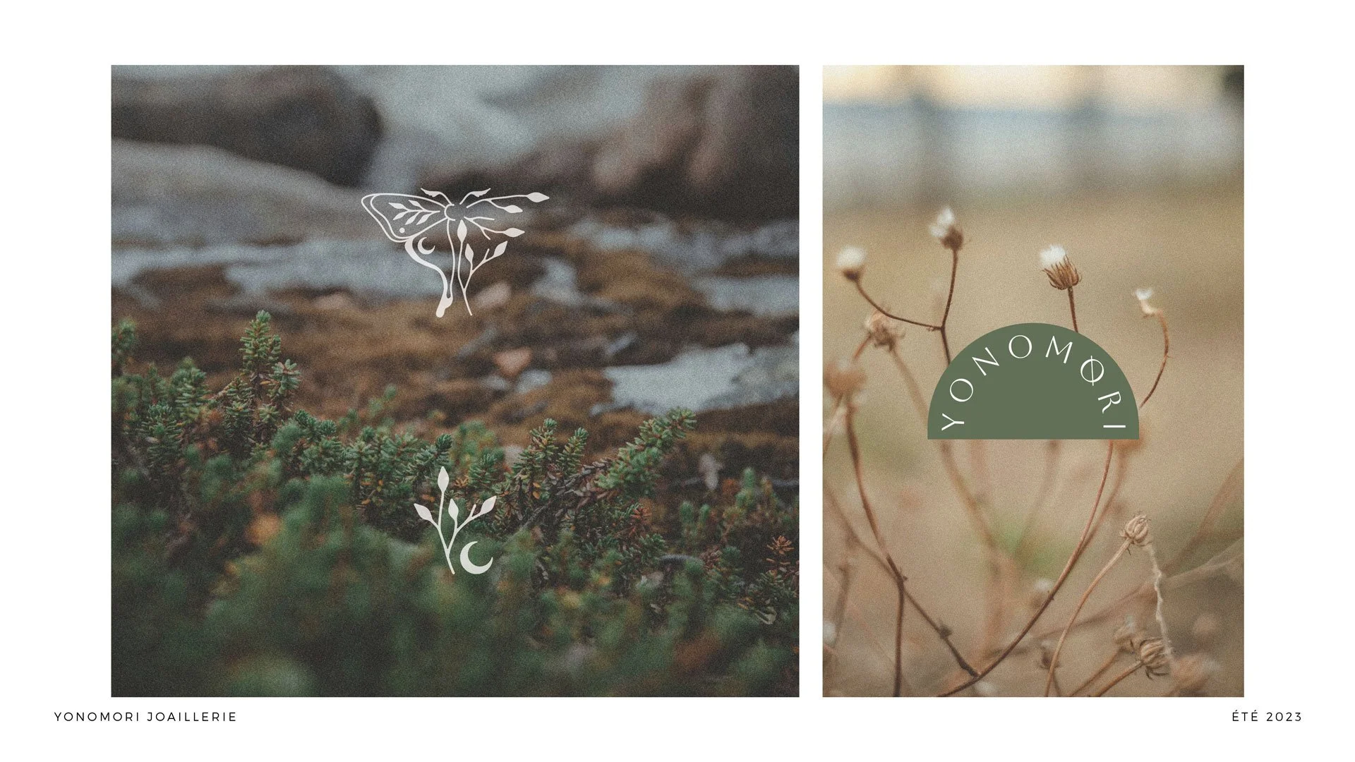 Business cards for Yonomori Joaillerie with a butterfly logo on dark green and purple leaves on the left, and a minimalist gray background with white botanical and celestial symbols on the right, labeled 'Été 2023'.